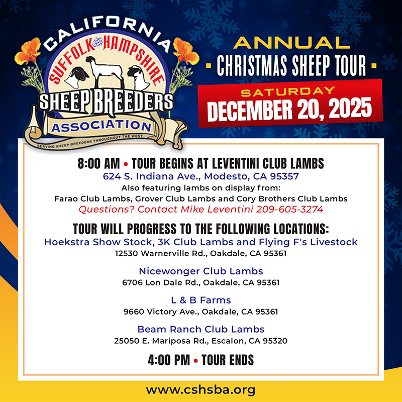 California Suffolk & Hampshire Sheep Breeders Association (CSHSBA) was formed to represent Suffolk and Hampshire sheep breeders in California. As time went on, crossbred or “wether dam” sheep became more prevalent, CSHSBA also included those breeders in the membership.